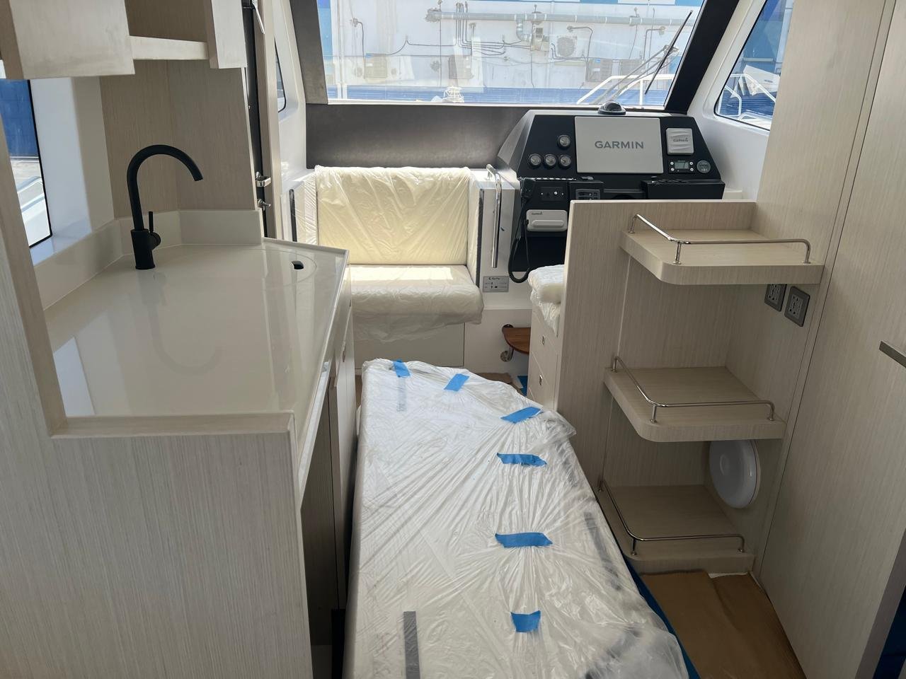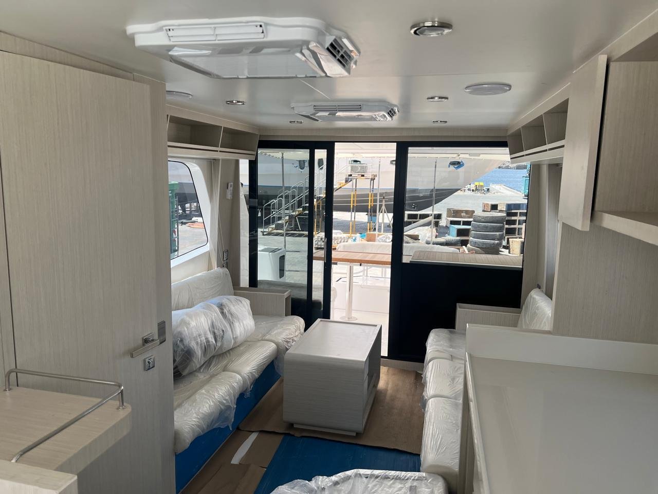 The Onyx 42 features an airy cockpit, a cozy lower deck living area, and two spacious cabins accommodating up to four guests comfortably.